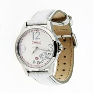 Classic Coach women's date watch 14501247. Round white dial with heart embossed with cystal. Silver leather strap. Stainless steel case with date window.