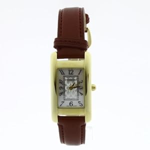 Coach Lexington ladies watch. Mother of pearl face with CC signature imprint. Golden bezel. Golden crown. Brown leather band. Swiss Quartz