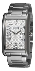 Stainless steel rectangle case (40mm x 30mm), Mother-of-pearl dial with the COACH 'C' logo in the background, Silver hands, White sweep second hand, Arabic numerals, Scratch resistant mineral crystal, Swiss quartz movement, Battery end-of-life indicator, Water resistant to 30 meters/ 100 feet, Stainless steel bracelet, Deployment clasp.