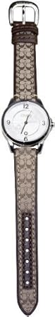 A Coach watch is a luxury anyone would love. From the signature wristband to the background on the face, this womens chronograph watch is covered in the classic Coach logo. Gorgeous brown leather backed jacquard signature wristband with leather accents. Silver tone buckle with seven closure options for the perfect fit. Stainless steel bezel with Coach logo etched in the face. Water resistant to 99 feet.