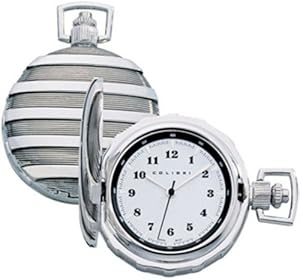 This Colibri timepiece has a polished silvertone finish with patinated barrel-cut lines. Quartz movement with black Arabic numerals and hands are assembled on a white dial. The inside of the case is engravable. Includes a matching 12 inch chain