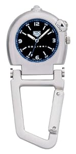 Colibri clip on pocket watch, quartz movement, black dial with luminous hands, easy to read numbers. Silver tone case with clip. this timepiece also features LED flashlight.