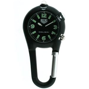 Colibre CX Gear pocket clip watch, black case with spring loaded clip,black dial with luminous markers and numbers, luminous hour minute and second hand, quartz movement, includes blue LED light at 12 o'clock position.