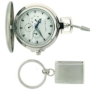 Colibri of London Stainless Steel Collection gift set comes complete with pocket watch, pocket watch chain and key ring. The pocket watch features hunting case, quartz movement, luminous hands and sub-dial hands with day and date. Each pieces comes in a polished steel design and can be engraved. Set is presented in gift box. Great gift idea!