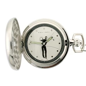 This great looking pocket watch is constructed with an engravable silvertone back and a golfer image on cover and dial. Timepiece features quartz three hand movement and silver markers and hands white dial with golfer image on dial and cover. Packaged in a wooden gift box with matching 12 inch chain.
