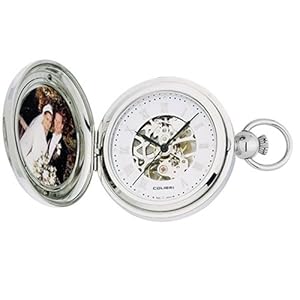From the Colibri Classic Series Collection 47mm (1 7/8" D) X 9/16" Thick Satin Silvertone Case with Hunter Cover White Chapter Ring with Raised Silvertone Roman Numerals 17 Jewel Mechanical Wind Movement Skeleton Dial with Exhibition Back Retaining Ring for Photo Inside Lid Matching 12" Curb Link Chain with Presentation Box.