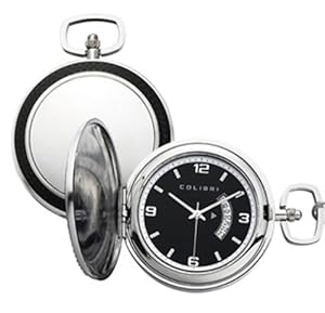 This Colibri timepiece has a polished engravable stainless steel cover and a black textured rubber border. Timepiece has quartz movement with luminous hands and a combination of luminous indexes and silver Arabic numerals assembled on a black dial with an eye for the day of the month. Includes a matching 12" chain.