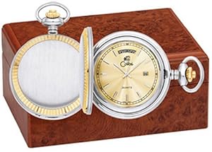 Versatile timepiece has a polished silvertone finish accented with goldtone. Three-hand quartz movement with polished silver indexes and polished silver hands are assembled on a brushed gold dial with an eye for the day of the month. Inside and outside of the case are engravable. Packaged attractively in a deluxe wooden box as a gift set with a matching 12" chain.