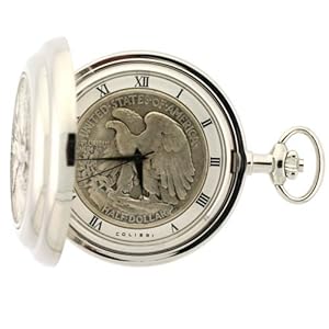 Polished engravable silvertone timepiece has a genuine liberty silver half dollar imbedded on the front of the case. Keepsake timepiece has quartz movement, black hands, and black Roman numerals set on a light gray chapter ring. The dial is assembled using the back of a genuine liberty silver half dollar. Packaged attractively in a deluxe wooden box as a gift set with a matching 12" chain.