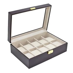 A beautiful watch display case to protect your precious watch collection. This high quality brown leatherette watch storage case features a clear lid to display your watches. The interior of this watch case is lined with plush beige fabric to protect your watches against scratches. There are 10 compartments with removable cushions. You may remove the cushions to store other items such as body jewelry, cuff link, spare links, watch tools or diamond rings. The watch case is safeguarded wi...