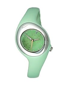Comfortably curvy, the Nike Triax Smooth analog women's watch blends a cooly contemporary design with a sporty ethos that will perfectly accent your casual couture. The one-piece, durable polyurethane mint green watch case and band form a unique S-shaped design that curves around your wrist. A highly polished silver aluminum face shield (with etched Nike logo) frames the spare mint dial face, which features silver-tone dot accents and silver baton hands (with seconds hand). Other feat...