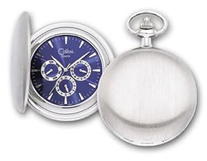 Colibri classical pocket watch, silver tone case, three eyed quartz movement , day date and 24 hour indicator, blue dial with silver markings and silver hands. Includes pocket watch chain. One year warranty.