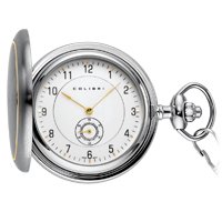 This stainless steel Colibri pocket watch features a 14kt. yellow gold ring on the cover, white dial with Arabic numbers and a goldtone indicator calendar. Chain included.