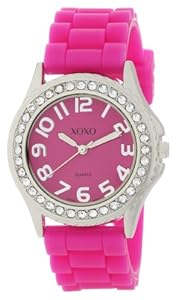 This is a beautiful boyfriend watch! It's dazzling 39.7mm. round silver metal case is accentuated with 36pcs. clear rhinestones on bezel. Fuchsia pink dial with silver Arabic numbers 1-12 & 3 hands with logo. The 9-1/2" light fuchsia silicone rubber strap has 8 holes and stainless steel buckle clasp closure which ideal for any wrist size. A must have!